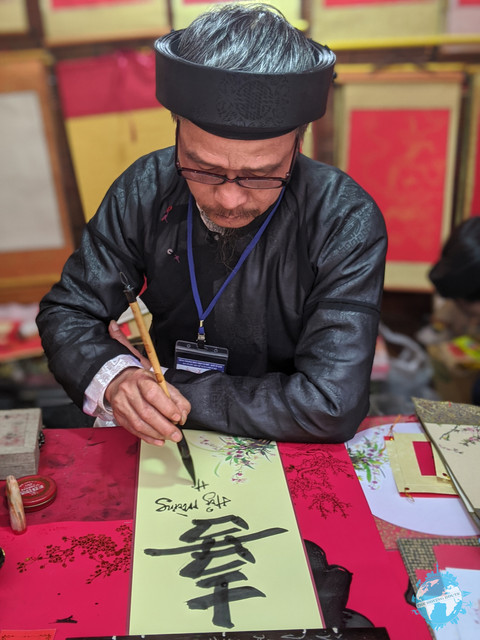 Across the street from the temple was the Calligraphy Festival. As Tet is the start of the New Year in Vietnam, it was traditional to come to the Temple to have calligraphers write wishes in Han Chinese characters. These intricate art pieces are then hung in the house helping to bring those wishes to life. Today, there are dozens of stalls set up with mostly older male calligraphers ready to help start your year off right. Each was incredibly skilled often with numerous massive wall hangings showing off their skills. Some were mainly dedicated to just the Han characters while others added elements such as cherry blossoms or bamboo into their designs.